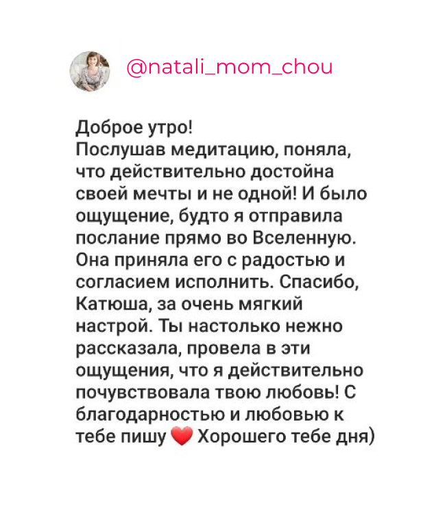 Эта практика направлена на то, чтобы для себя в жизни ты выбирала только самое лучшее и не соглашалась на меньшее. Научилась наполнять себя любовью, подарками, вниманием! С помощью медитации ты ощутишь, что ты самая прекрасная женщина на свете, невероятная нежная, влюбленная, расслабленная женственная, невероятно привлекательная! Ты проведешь свидание с самой собой! В конце будет задание, обязательно выполни его!